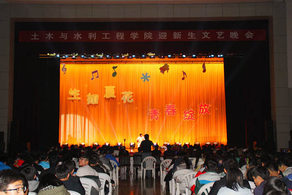 2014年11月5日晚,土水学院 以“生如夏花 青春绽放”为主题的迎新晚会在大学生活动中心隆重举行。3200威尼斯vip纪检委书记孔斌,土水学院院长田军仓,学院党委书记马正亮,校离退休人员服务处党总支副书记、关工委办公室主任刘彦宁,校团委副书记肖功国,校学生处副处长张少华,博士生导师孟云芳、张维江、李春光,学院党委副书记王德全、张强,学院副院长崔自治、尹娟、毛明杰、李应海、马彩霞,各系系主任、三办一中心主任、新生班班主任老师出席了此次晚会。