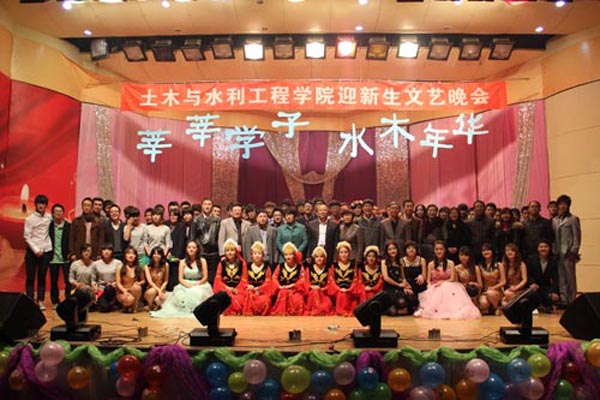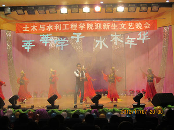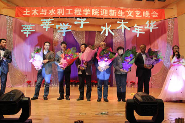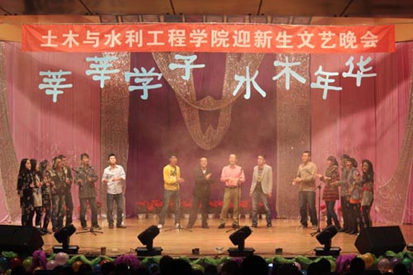 晚会在激情四射的乐队表演《Last of the well》中拉开序幕。马正亮书记代表学院作了热情洋溢的致辞。《江南 Style》点燃全场;一首《北京 北京》让全场观众为之呐喊;学办老师和研究生共同带来的歌曲串烧让场上场下连成一体;诗朗诵《坚定信念跟党走,共谱赞歌送党恩》表达了土木学子对党的深厚感情和对党的十八大胜利召开的热切期盼;话剧《戏说孔雀东南飞》以夸张的动作、幽默的语言、纯熟的舞台表现力一次次将台下观众逗得捧腹大笑;机械舞《The Legend》的表演者以帅气的动作、娴熟的技巧让同学们激动不已,赢得掌声连连;舞蹈《The boys》、《Nobody》以动感十足、活力四射的舞姿令大家感受到青春的无限活力;由威尼斯vip官网维吾尔族学生表演的民族歌舞,则彰显了少数民族能歌善舞的特长。晚会期间,田院长和马书记为威尼斯vip官网获得直博资格的齐一聪同学颁发了“院长特别奖”奖金和奖状;田军仓教授、孟云芳教授、张维江教授、李春光教授、王红雨教授、孙兆军教授六名博士生导师上台一一亮相,接受了同学们的献花和掌声,孟云芳教授代表博士生导师做了精彩的发言,对广大新生寄予厚望。最后,与会领导和嘉宾与所有演员合影留念。