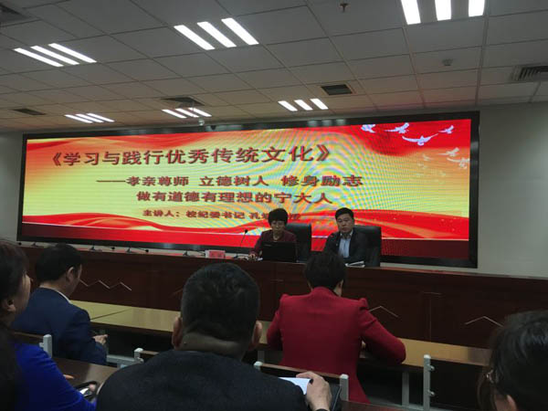 孔书记的报告紧密围绕中华民族五千年传统文化核心展开。报告中,她首先强调我们应正确认识和对待传统文化,传统文化不等于封建迷信。对于道德,她指出“道”是自然而然的规律,“德”是德行、修养,讲道德即是传统文化的核心思想。其次,孔书记还结合自身经历和当前热点事件,举例说法,对孝亲尊师、立德树人给出了自己独特的见解。报告最后,孔书记呼吁土水师生弘扬优秀传统文化,从孝做起,立德树人,修身励志,做一个有道德有理想的宁大人。