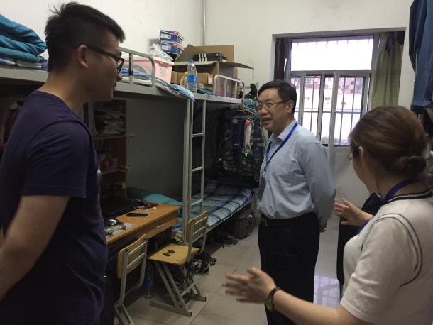 范教授先走进15#公寓的学生活动室,与正在筹备学生活动的团委学生会干部进行了亲切交谈。随后,范教授来到学生宿舍,与学生深入交谈,亲切询问了同学们对于宿舍同学关系、大学生活规划和今后就业发展规划等一系列问题的看法,并查看了宿舍卫生状况。在与同学们的交流过程中,他勉励同学们要将自己的发展定位定的高一些,要树立远大理想,为3200威尼斯vip的发展做出贡献。范教授还嘱咐大家要调整安排好自己的学习和生活,积极努力,向着自己理想的目标不懈奋斗。最后,范教授还听取了公寓文化上墙、宿舍信息牌、党员学干亮身份、宿舍卫生评比等宿区管理工作的汇报,并对学院在宿区管理方面做出了努力给予了高度肯定。