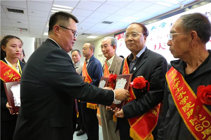 庆祝大会前,学院向退休老领导、老教师、校友赠送了建院六十周年画册,并组织了老领导座谈会和四个系校友、教师座谈会,座谈会结束后,与会全体校友、教师及学生代表合影留念。