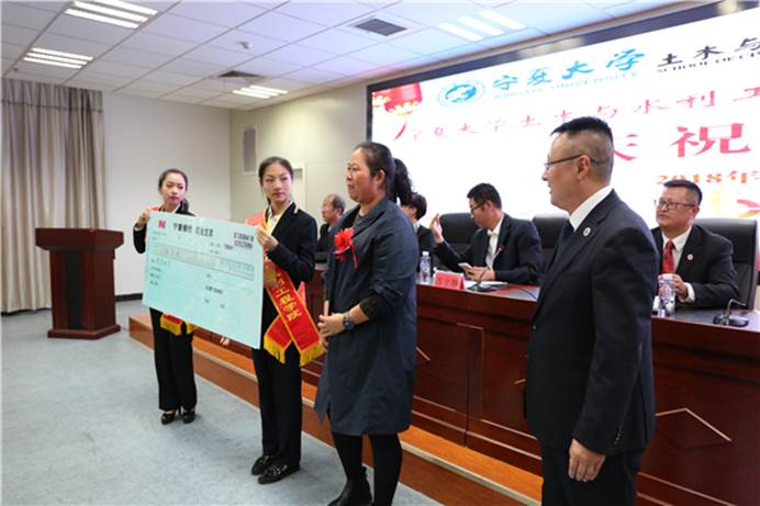 之后,学院校友代表银川宏达职业技能培训学校校长哈利琼向学院进行捐赠,哈利琼个人捐赠五万元,毛明杰院长接受了校友捐赠。