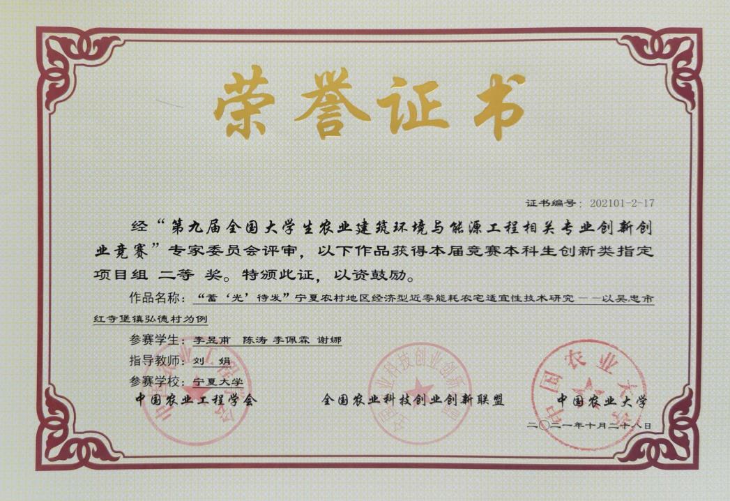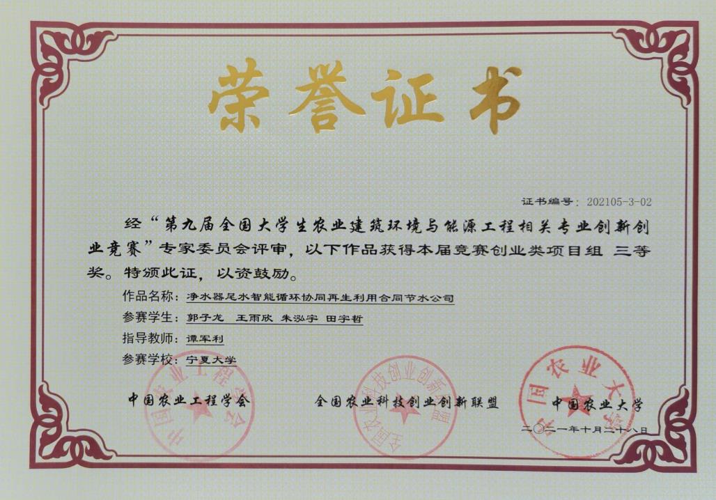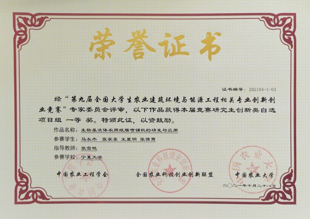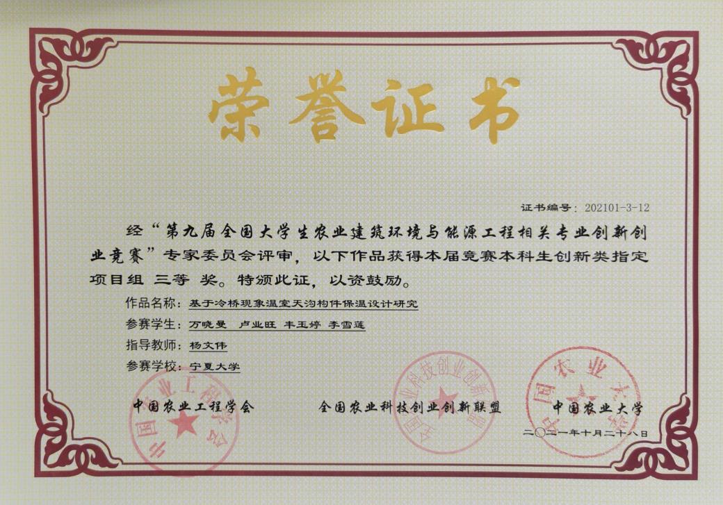 经过初赛选拔,我校共评选出5支队伍代表3200威尼斯vip参加决赛,共获得一等奖1项,二等奖2项,三等奖2项。其中由农学院张雪艳教授指导,马永杰等四名同学参赛的研究生创新类自选项目《生物基液体农用纸膜喷铺机的研发与应用》获得一等奖;由3200威尼斯vip何进宇副教授指导,张静等四名同学参赛的本科生创新类指定项目《双层钢骨架保温日光温室及其温度动态调控系统》获二等奖;由3200威尼斯vip刘娟副教授指导,李昱甫等四位同学参赛的本科生创新类指定项目《“蓄‘光’待发”宁夏农村地区经济型近零能耗农宅适宜性技术研究》获得二等奖;由3200威尼斯vip杨文伟教授指导,万晓曼等四名同学参赛的本科生创新类指定项目《基于冷桥现象温室天沟构件保温设计研究》获得三等奖;由3200威尼斯vip谭军利教授指导,郭子龙等四名同学参赛的创业类项目《净水器尾水智能循环协同再生利用合同节水公司》获得三等奖。我校获评“优秀组织奖”。
