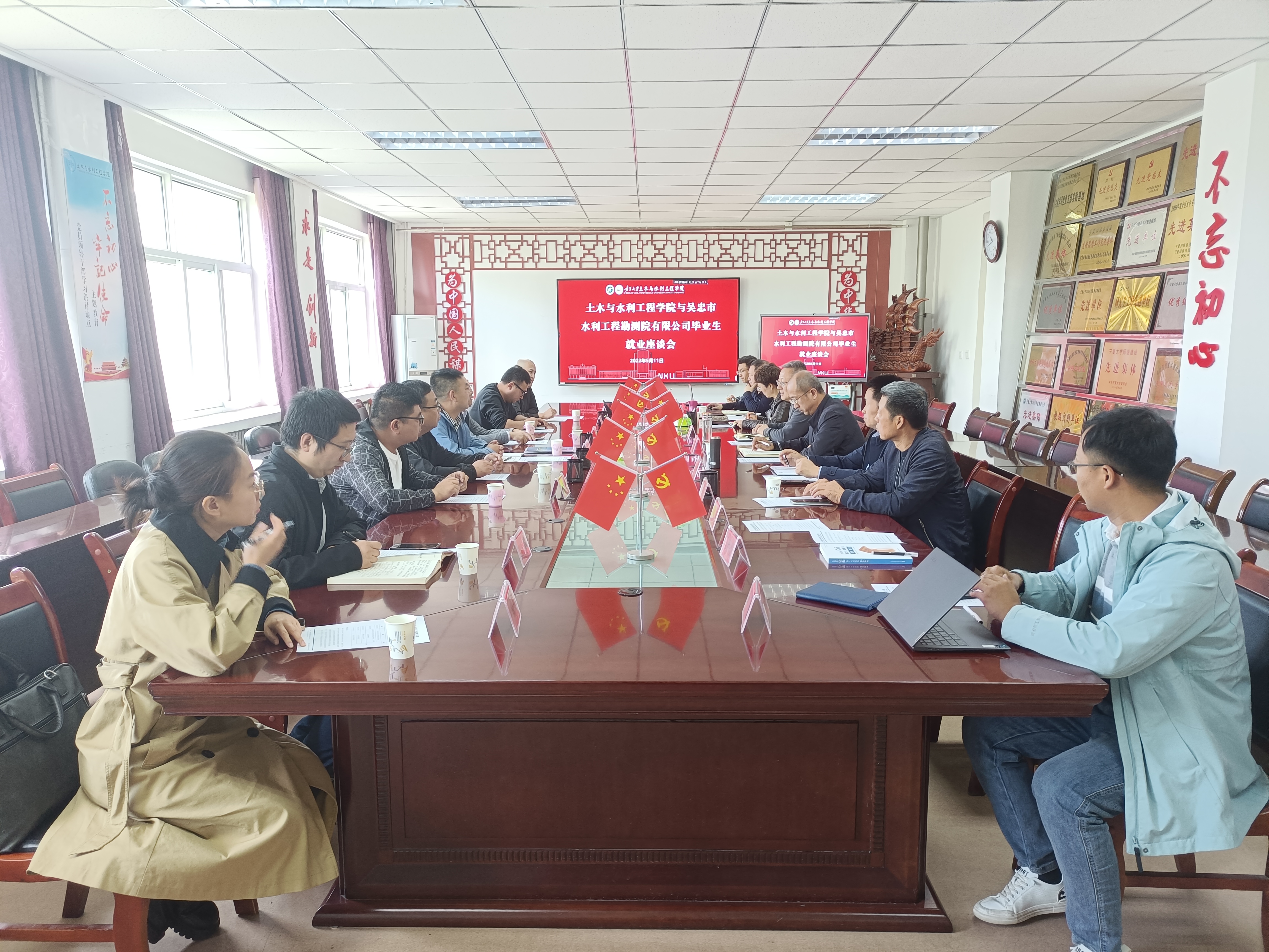 2023年5月11日上午吴忠市水利工程勘测设计院有限公司党委书记、董事长刘国辉一行到访3200威尼斯vip进行校企合作与毕业生招聘座谈。院长毛明杰、副院长刘海峰、李王成、徐利岗、各系负责人、班主任和教师代表参加了座谈,会议由刘海峰副院长主持。