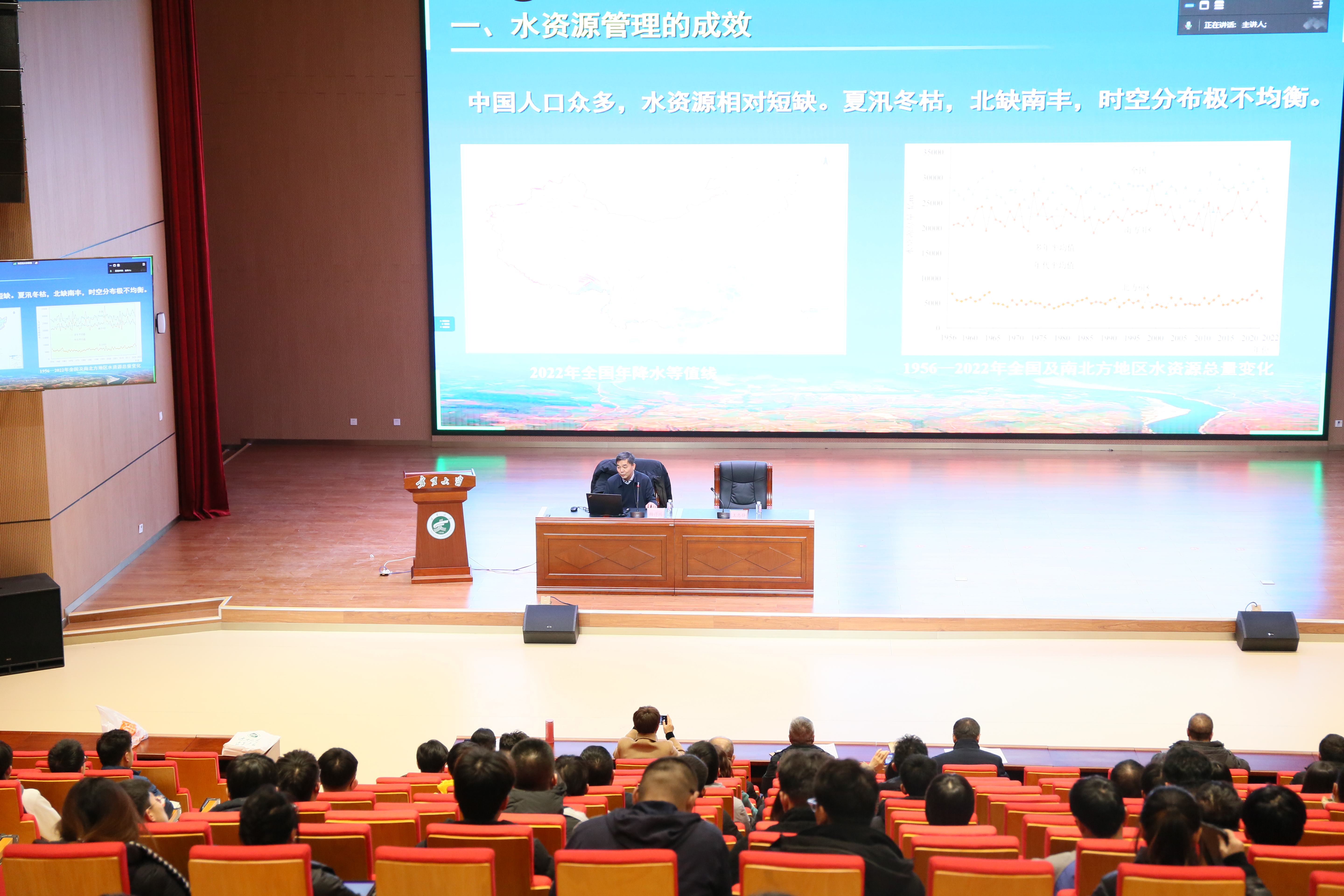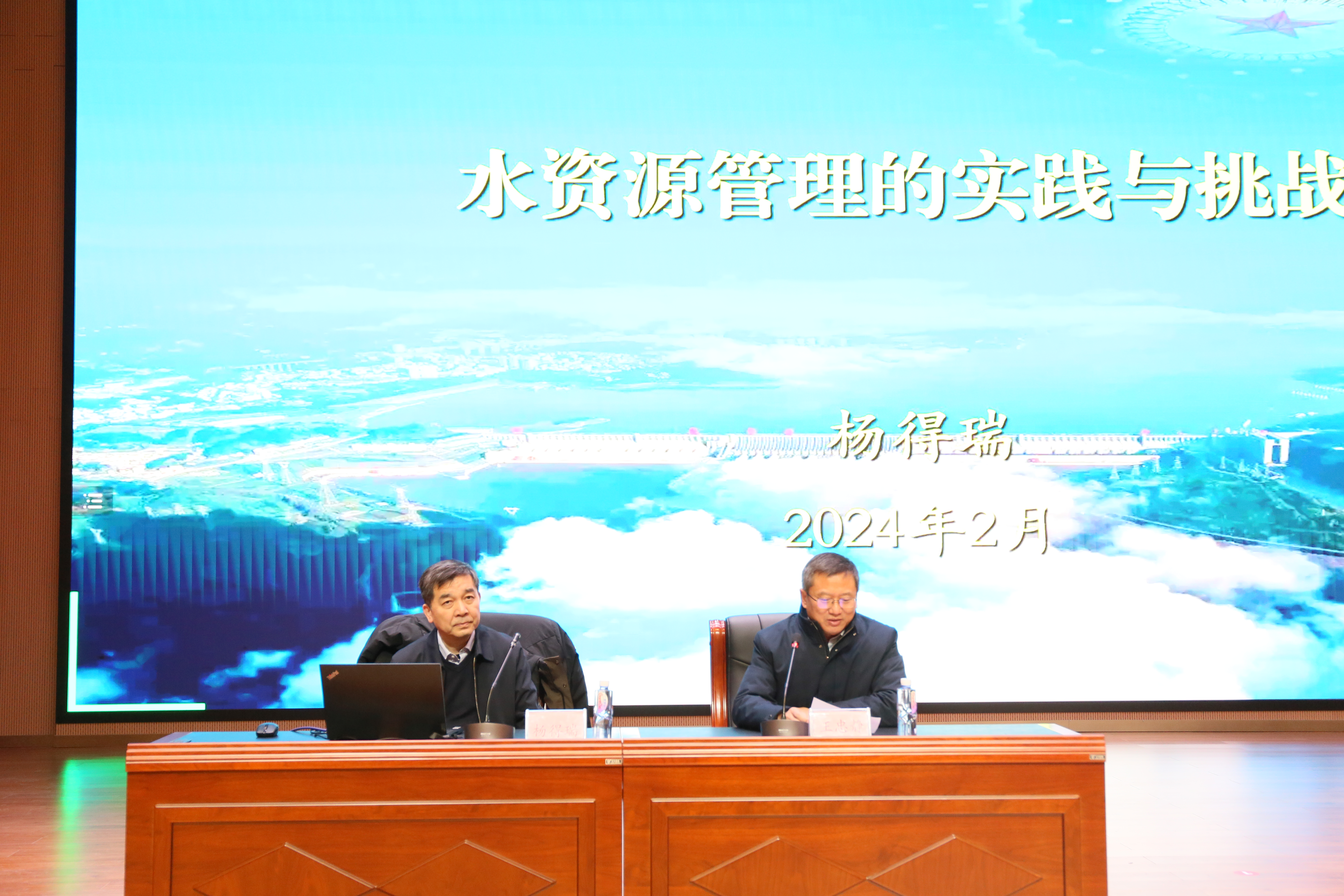 2024年2月28日下午,贺兰山学术讲座第六十六期在贺兰山校区未来教室一楼报告厅举行,原水利部水资源司司长杨得瑞教授级高工应邀为我校师生作“水资源管理的实践与挑战”学术报告。报告会由校党委常委、副校长王忠静主持,线上线下同步的方式进行,宁夏水利行业相关专业人士、3200威尼斯vip3200威尼斯vip领导班子成员、师生等300余人聆听了报告会。