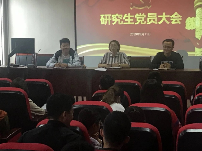 2019年9月11日上午,2019年秋季学期研究生党员大会在知行楼508会议室顺利召开。学院学生党建负责人陶雪梅、研究生党支部书记包超和王瑞以及全体研究生党员参加了此次大会。