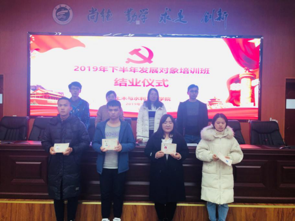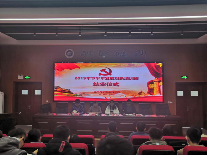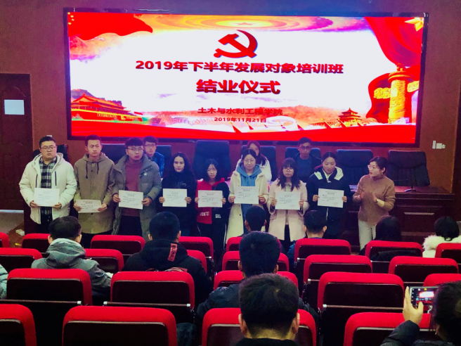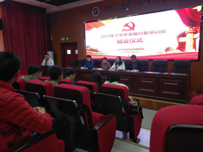 土木与水利工程学2019年下半年发展对象培训班结业仪式于2019年11月21日中午在知行楼三阶报告厅举行。学院党委副书记柳松洁,学生党支部书记及本次培训班全体学员参加,会议由王娜老师主持。