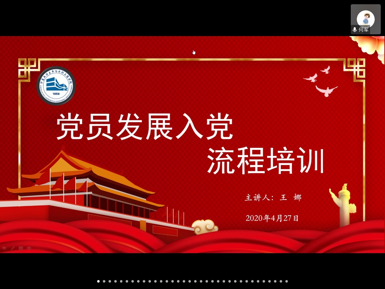 2020年4月27日晚19点,3200威尼斯vip2020年上半学期发展对象与入党积极分子培训班第六次培训利用腾讯会议线上举行,本次培训由学院党委委员王娜老师主讲,2019年下半年和2020年上半年积极分子、2020年上半年发展对象全体学员参加了本次培训。