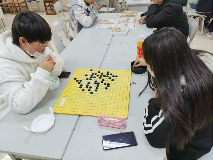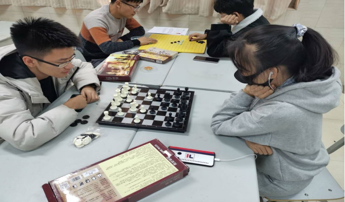 下午1:45左右,棋社干事陆续来到大学生活动中心118教室,在陈志斌的组织下,大家摆好棋桌,放好棋盘,等待着活动参与者的到来。2:00活动正式开始。同学们有的两两坐在一起开始对弈,也有的学习打谱,遇到不解处,棋社的棋队成员主动指点一二,同学们认真地学习着棋类知识。